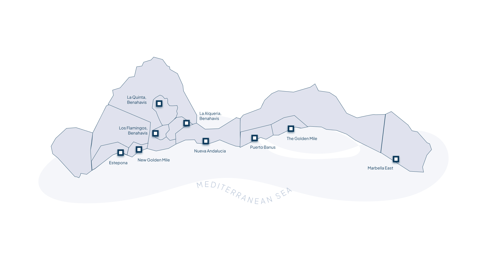 Buying property in Marbella means enjoying the best of the Costa del Sol lifestyle. Our guide highlights the region’s top areas: the scenic and exclusive Benahavís; La Quinta’s stunning golf and mountain vistas; the prestigious Golden Mile with its luxury beachfront homes; vibrant Puerto Banús, known for its marina and nightlife; and Marbella East’s relaxed, family-friendly beaches. With our expert support, start discovering your ideal location today.