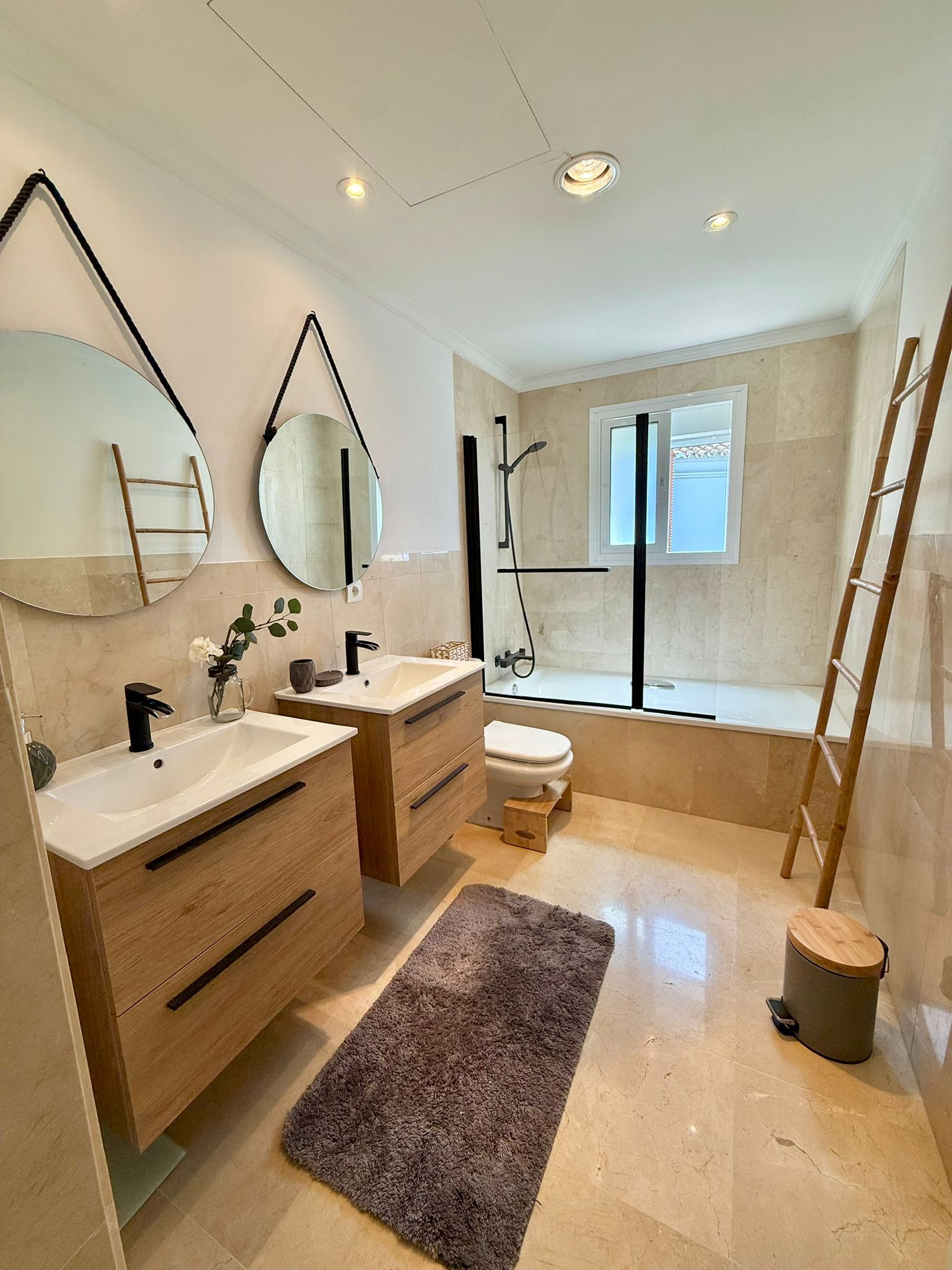 Downstairs, with its own entrance and direct access to the lush garden we find the very spacious 70m2 private studio apartment, featuring a full kitchen, bathroom with shower, washing machine, lounge area with pull-out couch, 2 single beds, and air conditioning.